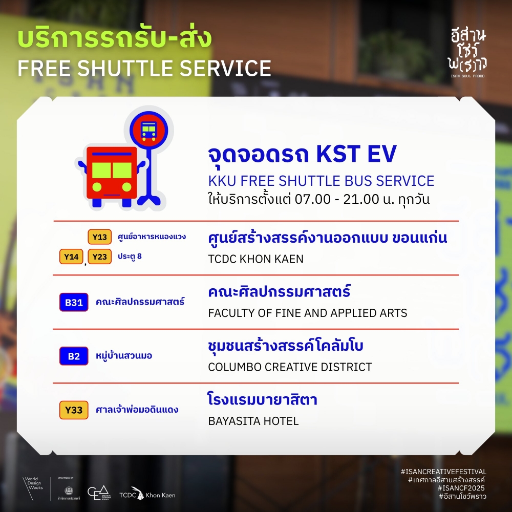 คนขอนแก่นเชิญไปม่วนคักปักหมุดทุกจุดได้แล้ววันนี้ สำหรับการเดินทาง ผู้จัดมี Shuttle Bus พร้อมอำนวยความสะดวกให้แต่ละจุด หรือใช้บริการเรียก Bolt ก็มีโค้ดส่วนลด ตามไปดูให้เห็นกับตาแล้วจะรู้ว่า อีสานโซ(ว์)น่ารักและสร้างสรรค์ขั้นสุด สามารถดูข้อมูลเพิ่มเติมของโปรแกรมทั้งหมดได้ที่ https://www.isancreativefestival.com/isancf2025/program และ Facebook: @IsanCreativeFestival
