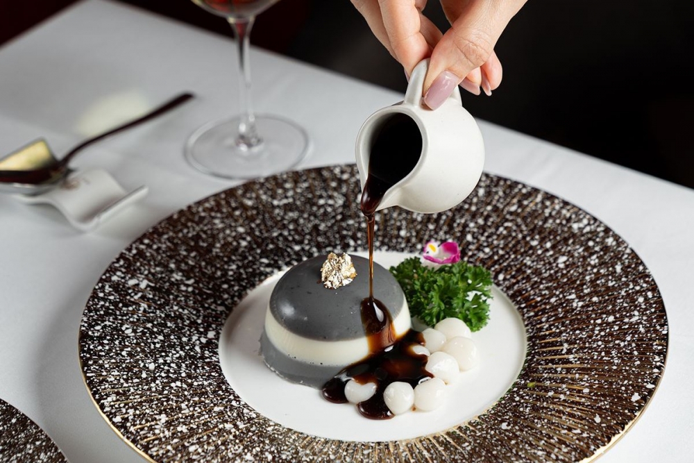 ปิดท้ายดับ Dessert พุดดิ้งงาดำคัสตาร์ดลาวา (Black Sesame Pudding with Custard Lava) ปิดท้ายด้วยความหอมมันสไตล์เอเชียร่วมสมัย พุดดิ้งงาดำ พร้อมคัสตาร์ดลาวา ปิดท้ายมื้อพิเศษ