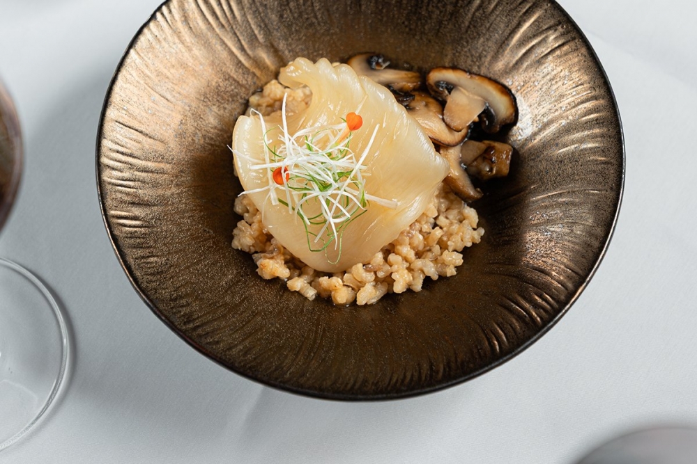 ตามด้วย Main Course อย่างรีซอตโต้กระเพาะปลาสดตุ๋น (Risotto with Stewed Fresh Fish Maw) รสชาตินุ่มนวลและสมดุลอย่างลงตัว ข้าวรีซอตโต้คลุกเคล้าซอสสูตรเฉพาะ พร้อมกระเพาะปลาสดตุ๋นจนนุ่ม