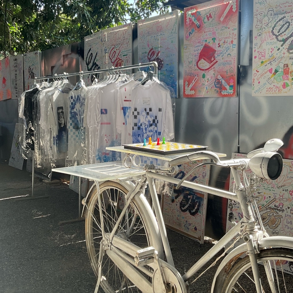 ในส่วนของพื้นที่จัดแสดงผลงานศิลปะ ฟาโรห์บอกว่ามีทั้งนิทรรศการถาวรและหมุนเวียน จัดแสดงผลงานภาพเขียน งานปั้น งานคราฟต์ เครื่องแต่งกายและที่ขาดไม่ได้ คือ งานเครื่องเงินของครอบครัว ร่วมด้วยกิจกรรมเวิร์คช้อปสร้างสรรค์ที่ชวนมาเพ้นท์ลายลงบนเสื้อยืดให้ลุ้นกันเองว่าจะ error หรือ perfect
