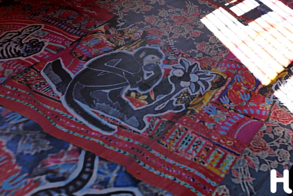 ด้วยพื้นที่จัดแสดง 3 อาคารเก่าบนถนนทรงวาด โอรับหน้าที่ออกแบบนิทรรศการทั้งหมดโดยซื่อสัตย์กับตัวตนของผู้ริเริ่มโครงการอย่างแจะที่สุด เขาเลือก “ไม่แตะผนัง” เพราะเจ้าของตึกหวง แต่เลือกใช้ “พื้น” เป็นผืนผ้าใบแทน วางลายบาติกบนพื้น แล้วเชื่อมสามอาคารเข้าด้วยกัน ราวกับเป็นแพตช์เวิร์กของเรื่องเล่า เหมือนดีเอ็นเอของพี่แจะที่หยิบแพตเทิร์นเล็กๆ จากทุกหนแห่งมาต่อเป็นโลกของเธอ