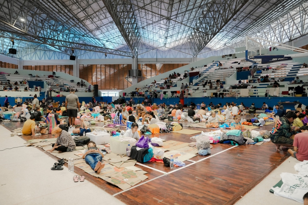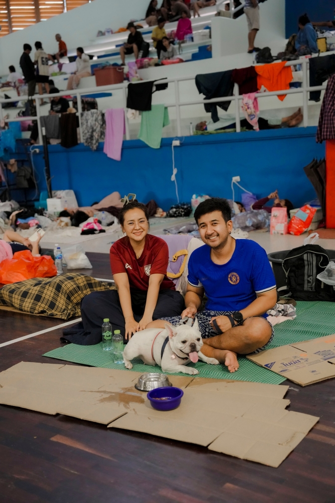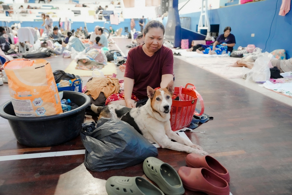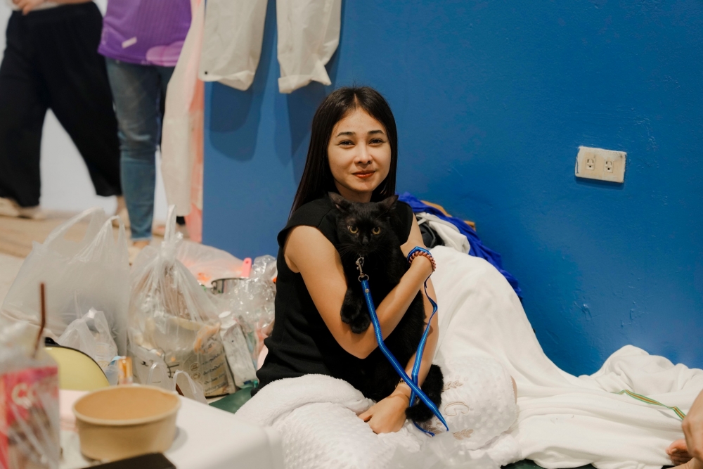 บางคนคอยอุ้มสัตว์เลี้ยงตลอดเวลา บางครอบครัวสละพื้นที่นอนของตัวเองเพื่อวางกรงให้สัตว์เลี้ยงได้พักผ่อน เด็กๆ ในศูนย์พักพิงก็ช่วยกันเล่นกับสัตว์เลี้ยงจนบรรยากาศเต็มไปด้วยรอยยิ้ม