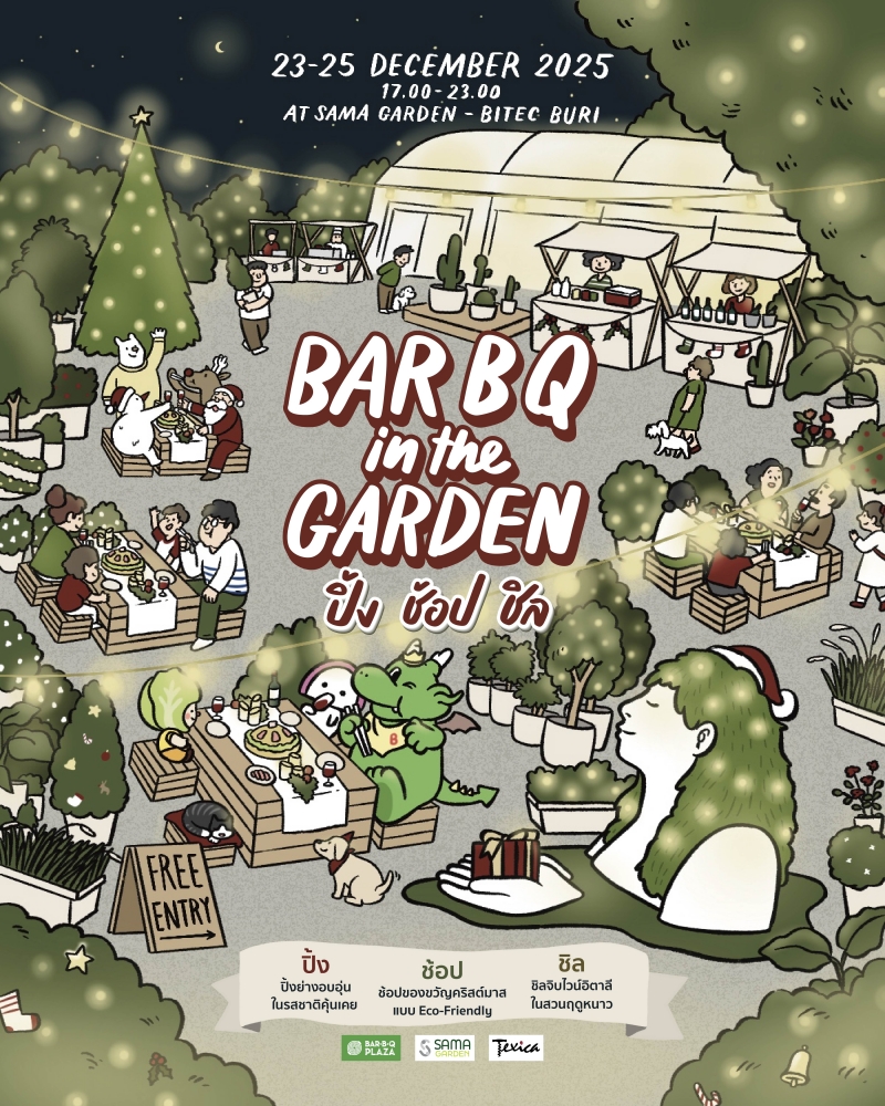 คริสต์มาสปีนี้บางนากำลังจะมีอะไรให้วาร์ปมาแฮงเอาต์ เพราะ Bar B Q Plaza, SAMA Garden และ Texica Wine จับมือกันจัดงานบรรยากาศดีแสนอบอุ่น ให้ชาวออฟฟิศมาผ่อนคลายช่วงสิ้นปี ในคอนเซปต์ “ปิ้ง ช้อป ชิล” รับลมหนาวท่ามกลางสวนใจกลางบางนาที่ถูกแต่งเติมกลิ่นอายความ Christmas Barn แบบพอดิบพอดี โดยงานจะจัดในวันที่ 23–25 ธันวาคม 2568 ตั้งแต่เวลา 17.00–23.00 น. ที่ SAMA Garden, BITEC BURI บอกเลยว่า Mood ดีจนอยากชวนทุกคนพาคนสำคัญมาสร้างโมเมนต์คริสต์มาสน่ารัก ๆ รับปลายปีไปด้วยกัน