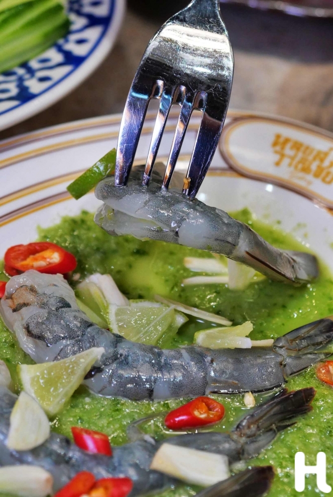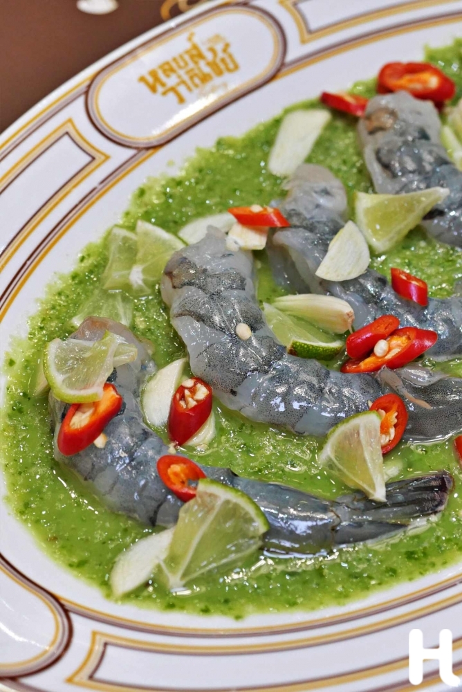 กุ้งแช่น้ำปลาแซ่บ เปิดมื้อด้วยความสดที่ไม่ปรานีใคร กุ้งสดเนื้อเด้งเรียงตัวสวย หอมมะนาวและพริกขี้หนูจี้ดๆ เป็นจานที่ “ปลุกสัญชาตญาณนักกิน” ได้ทันที