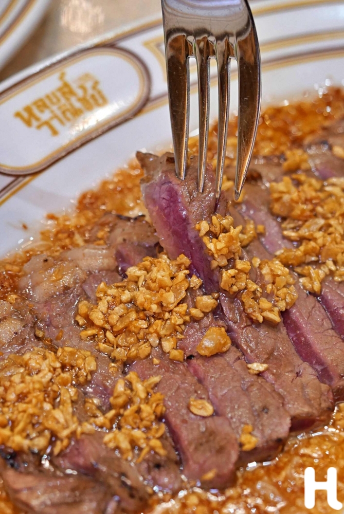 เนื้อทอดซอสน้ำมันกระเทียม จานที่สง่างามขึ้นด้วยเนื้อแบล็กแองกัส เมนูขายดีจากบรรทัดทองถูกดึงให้พรีเมียมขึ้นด้วยเนื้อออสเตรเลียนแบล็กแองกัส ด้านนอกหอมกระเทียม แต่เนื้อยังฉ่ำกลางคำ เคล้ากลิ่นน้ำมันกระเทียมเป็นเอกลักษณ์ที่หลายคนคิดถึง