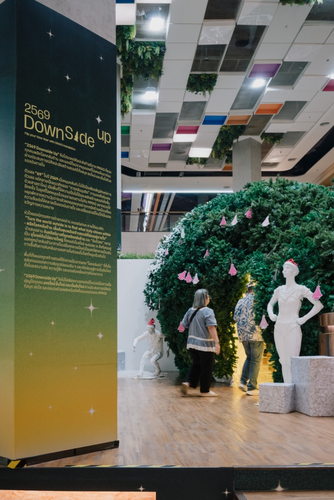 “2569 Downside Up” โปรเจกต์ศิลปะส่งท้ายปีจาก MMAD ที่ชวนทุกคนพลิกโลกกลับด้าน และมองปีใหม่จากมุมมองที่ไม่เคยเห็นมาก่อน ผ่านประสบการณ์ศิลปะเชิงสร้างสรรค์ที่ทั้งสนุก สดใหม่ และเต็มไปด้วยแรงบันดาลใจ ตัวเลข “69” ในปี 2569 เมื่อหมุนกลับหัว ไม่ได้เป็นเพียงสัญลักษณ์ทางตัวเลข แต่กลายเป็นแนวคิดของ “การกลับมุมคิด” การมองสิ่งคุ้นเคยด้วยสายตาใหม่ เมื่อต้นคริสต์มาสถูกพลิกกลับด้าน และ ล้มตัวลง จนกลายเป็น อุโมงค์ต้นไม้ขนาดใหญ่ ที่ตกแต่งในสไตล์ outside in สิ่งที่เคยอยู่นอกถูกนำกลับเข้ามาภายใน “โลกกลับหัว” ที่ตั้งใจสลัดกรอบของความสมบูรณ์แบบเดิม ๆ และเปิดประตูสู่การเริ่มต้นใหม่ ทั้งในแง่ความคิด ความรู้สึก และแรงขับเคลื่อนทางจินตนาการ “2569 Downside Up” จึงไม่ใช่เพียงงานตกแต่งปีใหม่ แต่เป็นการเชื้อเชิญให้ทุกคน มองใหม่ ยิ้มใหม่ และเริ่มต้นใหม่ ผ่านประสบการณ์ศิลปะที่สนุก สดใส และอบอวลด้วยพลังครีเอทีฟในแบบฉบับของ MMAD