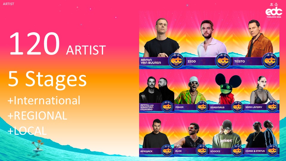 เตรียมต้อนรับทัพศิลปินอิเล็กทรอนิกส์ระดับท็อปของโลกที่จะมาสร้างความเดือด นำโดยเฮดไลเนอร์ตัวพ่อ อย่าง TIËSTO, ZEDD, ARMIN VAN BUUREN, การจับคู่สุดพิเศษของ AXWELL B2B SEBASTIAN INGROSSO, FISHER, DEADMAU5, AFROJACK, ALOK, CHASE & STATUS และอีกมากมาย พร้อมด้วยศิลปินไทยและในภูมิภาคที่น่าจับตามอง