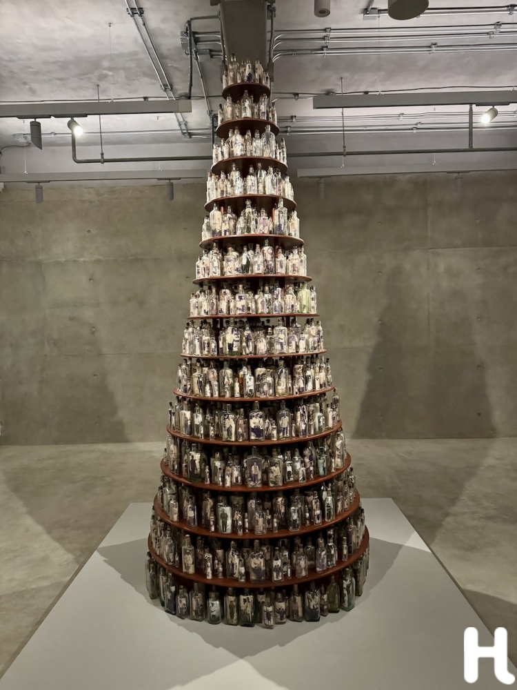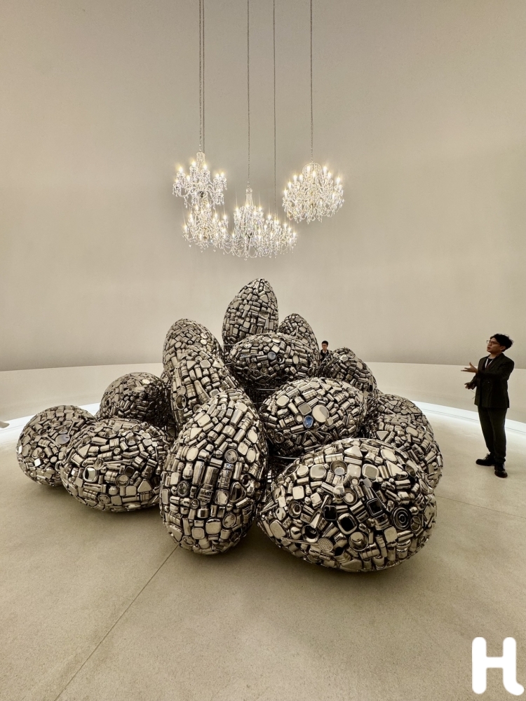 เริ่มจากผลงานศิลปะขนาดยักษ์รูปทรงเหมือนลูกรักบี้ห่อด้วยฟอยล์สีเงิน ที่ห้อยอยู่กลาง Courtyard Gallery ที่ชั้น 1 ผลงานของศิลปิน ลี บุล ที่สะดุดตากับขนาด ผิวมันเงา และถ้าเข้าไปใกล้จะได้ยินเสียงลมข้างใน ถัดมาเป็นผลงานของ Jannis Kounellis ในขนาดที่น่าตื่นตาและน้ำหนักมากเพราะเป็นโครงเหล็กขนาดใหญ่เท่ากับเตียงคู่ 2 เตียงพาดกลางแนวขวางด้วยแท่งเหล็ก 2 แท่งมีผ้าม้วนหลากสีตรงกลาง ต่อด้วยผลงานของศิลปินไทย สุรสีห์ กุศลวงศ์ ที่ชวนให้นึกถึงความประทับใจในวันเก่า เมื่อไปเที่ยวกับครอบครัว ด้วยการจับรถโฟล์คเต่าหงายท้อง เปลี่ยนภายในรถให้กลายเป็นที่นอนเล่น มีจอทีวีที่ฉายวีดีโอภาพวิถีชีวิตบนสายน้ำ ที่เหมือนเรานอนอยู่บนเรือล่องไปตามแม่น้ำทั้งวัน