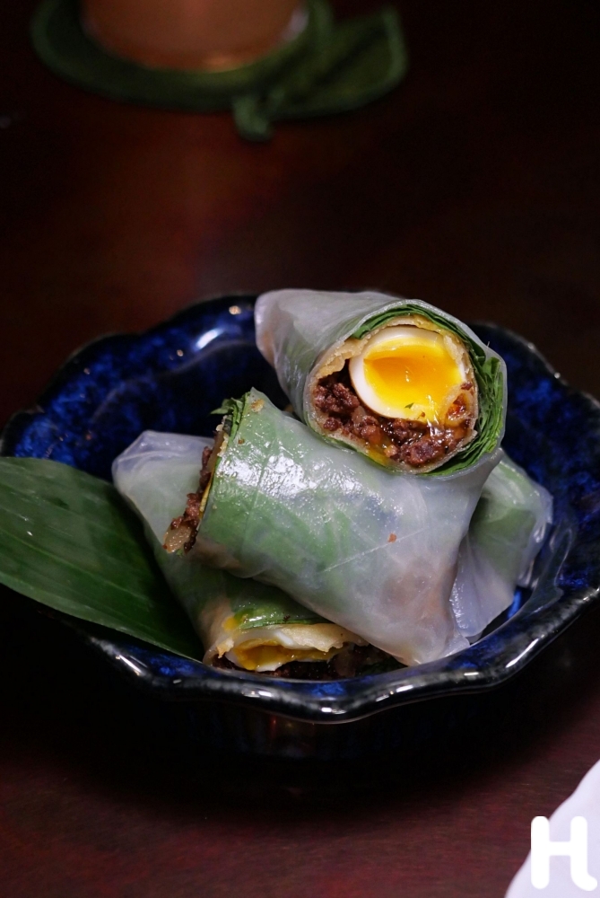 เริ่มต้นด้วย Pad Krapao Spring Rolls ปอเปี๊ยะผัดกะเพราที่ดูเผินๆ เหมือนของกินเล่น แต่ซ่อนความจริงจังไว้ด้านใน ทั้งเนื้อวัวฉ่ำ ไข่นกกระทา และกลิ่นโหระพาที่คุ้นเคย กลายเป็นคำเปิดบทสนทนาที่ทำให้รู้ทันทีว่า...นี่ไม่ใช่มื้ออาหารธรรมดา