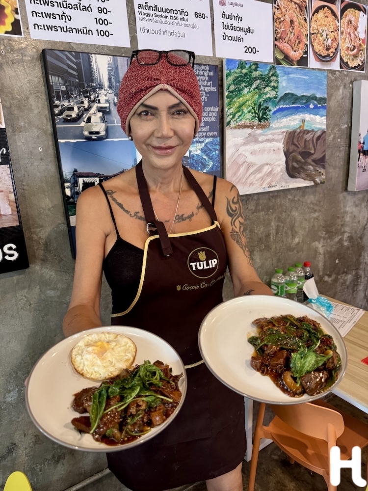 สำหรับสายเนื้อ หรือใครที่คิดไม่ออกว่าจะกินอะไร ผัดกะเพรา เมนูอิ่มท้องสบายใจคือคำตอบ แต่กะเพราที่นี่ไม่ธรรมดา เพราะใช้เนื้อตุ๋นที่ทางร้านทำเอง นุ่ม ชุ่มฉ่ำ รสชาติเข้มข้นกลมกล่อม เสิร์ฟคู่ไข่ดาวขอบเกรียมกรอบ แต่ไข่แดงยังเยิ้ม เพิ่มความฟินขึ้นอีกหลายระดับ หรือจะสั่งกะเพราหมูกรอบที่เจ้าของร้านทำเอง เป็นหมูกรอบหอมใหม่ๆ ที่อร่อยไปอีกแบบ