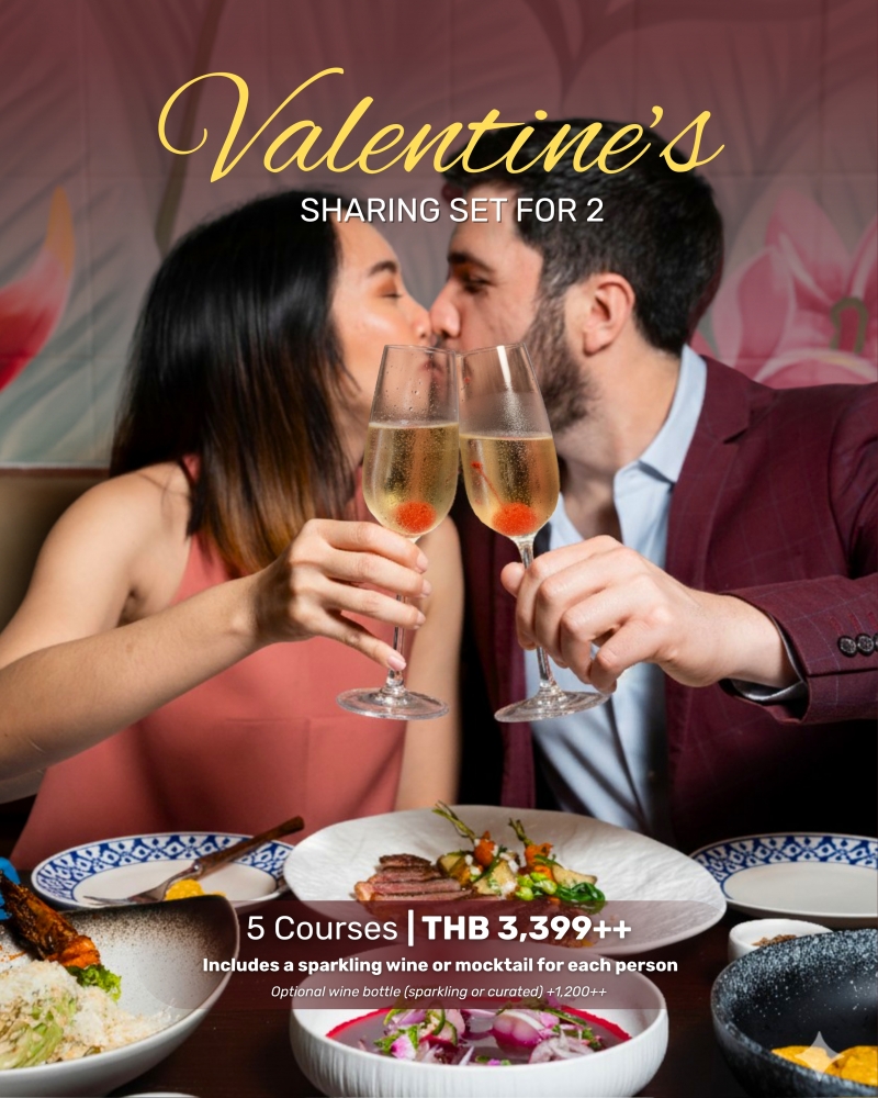 Valentine’s Sharing Set ราคาเซ็ตละ 3,399++ บาท สำหรับ 2 ท่าน รวมเครื่องดื่มต้อนรับ สปาร์กลิงไวน์หรือซิกเนเจอร์ม็อกเทล (ท่านละ 1 แก้ว) และเติมเต็มบรรยากาศโรแมนติกด้วยไวน์ทั้งขวด (สปาร์กลิงหรือไวน์คัดสรร) เพียง 1,200++ บาท ตั้งแต่วันที่ 13–15 กุมภาพันธ์ 2569 นี้เท่านั้น