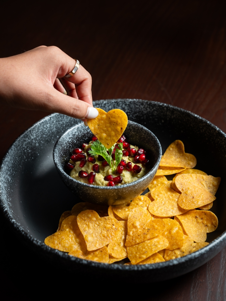 เริ่มต้นความหวานด้วยออเดิร์ฟ Guacamole with Pomegranate กัวคาโมเล่รสมันนัวตัดด้วยความสดชื่นของทับทิม เสิร์ฟคู่กับตอร์ติญ่ากรอบรูปหัวใจ