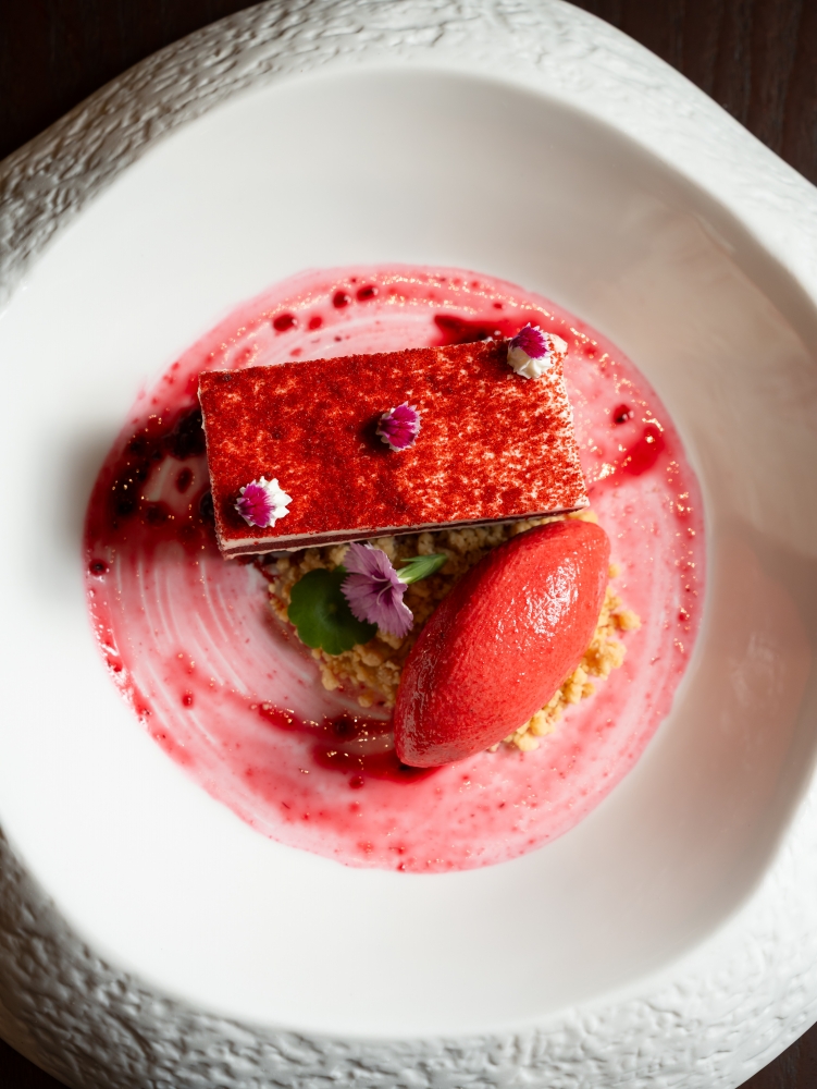 ก่อนปิดท้ายค่ำคืนแสนหวานด้วย Red Velvet Cake เค้กเรดเวลเวทเนื้อนุ่มละมุนลิ้น ทานคู่กับสตรอว์เบอร์รีซอร์เบท์โฮมเมด