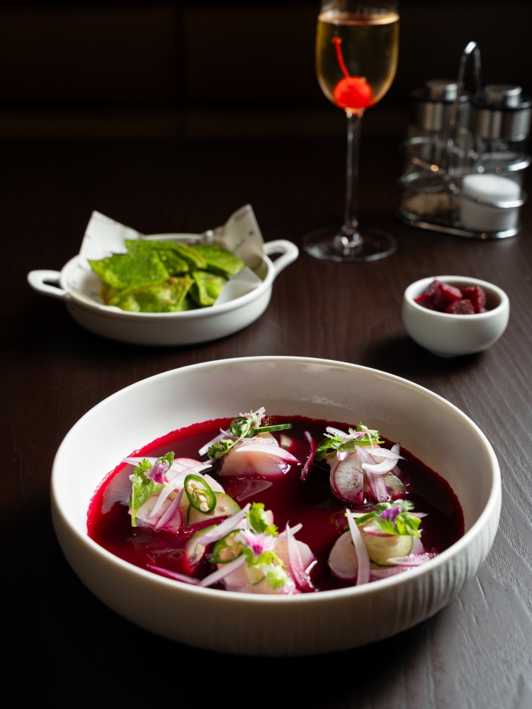 ต่อด้วย Beetroot Aguachile เมนูเรียกน้ำย่อยที่ผสานความสดของหอยเชลล์และปลาหมึกในน้ำซุปบีทรูทมิโซะ และ Grilled Caesar with “Kissing” Prawns ซีซาร์สลัดย่างหอมกรุ่น เสิร์ฟพร้อมกุ้งหมักเตกิล่ารสเลิศ