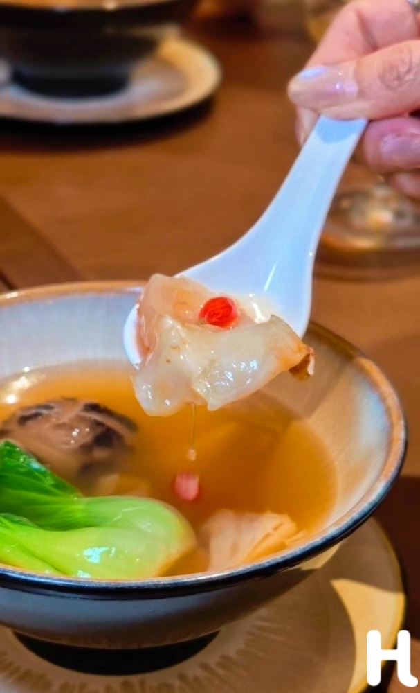 ซุปกระเพาะปลาสดตุ๋นกังป๋วยและเห็ดปุยฝ้าย กระเพาะปลาเปรียบดังถุงเงินถุงทอง วัตถุดิบล้ำค่าที่สะท้อนฐานะและความอุดม เชฟเคี่ยวน้ำซุปนานหนึ่งวันเต็มจากขาหมูยูนนาน สะโพกไก่ และเท้าไก่ จนได้รสเข้มลึก กลมกล่อม