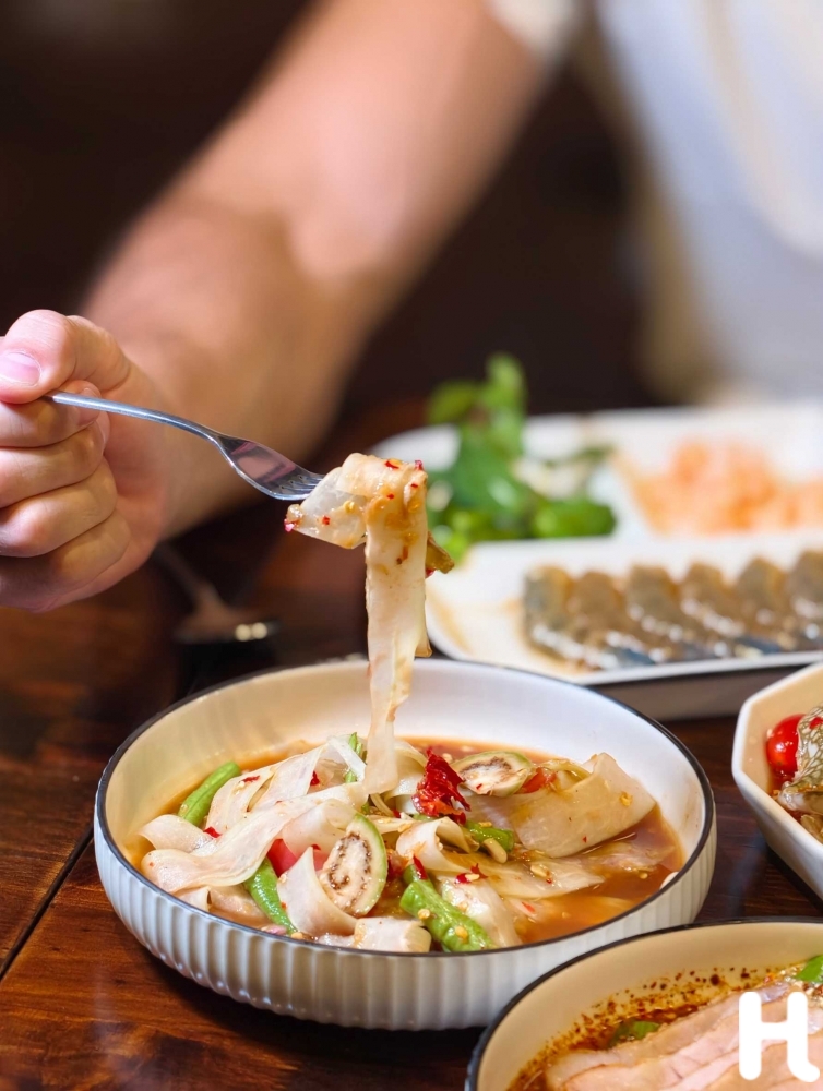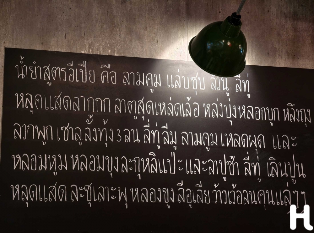 หัวใจของอีเปียคือ “น้ำยำอีเปียสูตรเฉพาะ” ที่ปรับบาลานซ์ต่างกันในแต่ละเมนู ไม่ใช่แค่เผ็ด เปรี้ยว เค็ม หวาน แต่มีเลเยอร์ของกลิ่นสมุนไพร ความหอมข้าวคั่ว และสัมผัสวัตถุดิบที่ชัดเจน