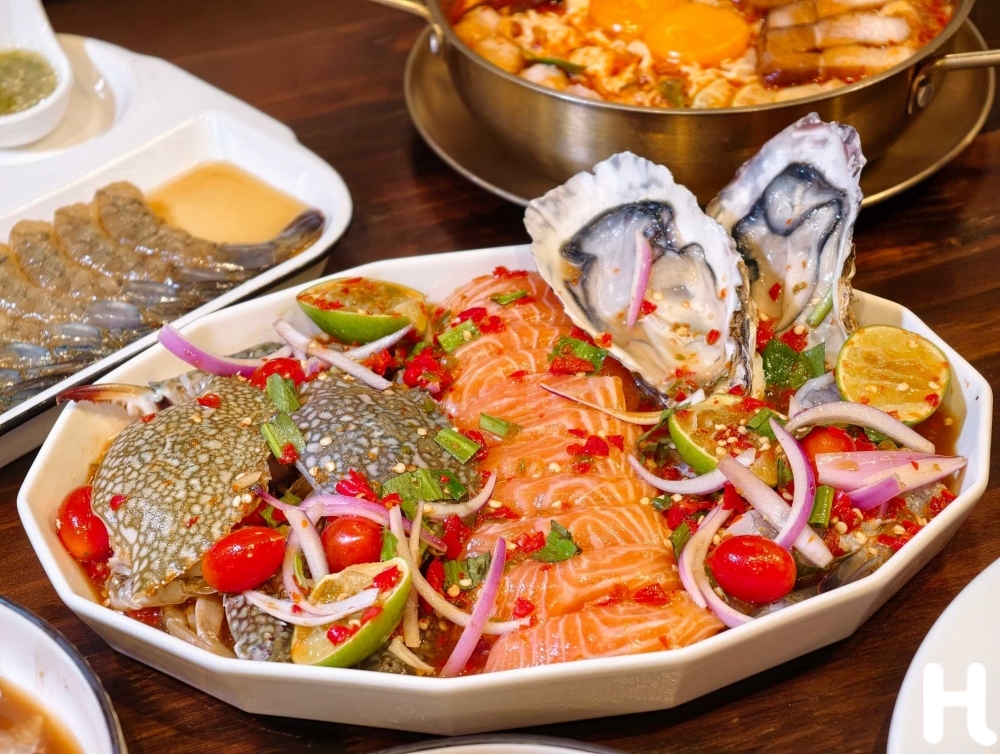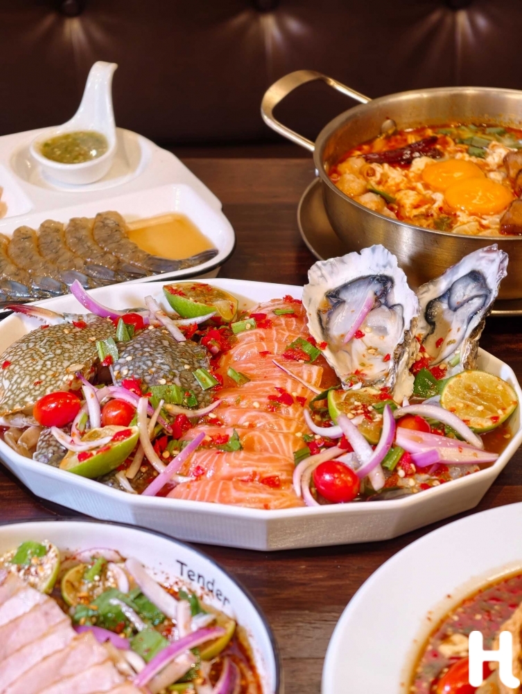เมนูที่ห้ามพลาด เริ่มที่ ยำอีเปียมหาสมุทร (690 บาท) รวมพลเจ้าทะเลแบบสดๆ ทั้งปู กุ้ง หอยนางรม แซลมอน จัดเต็มราวกับยกอ่าวไทยมาไว้ในชามเดียว