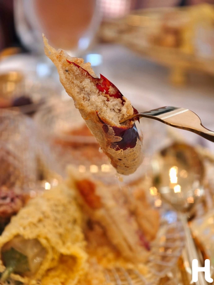 ถัดมาที่เครื่องเคียงอย่างชาววังอย่าง “พริกหยวกสอดไส้ห่มแพไข่รังบวบ” หรือหรุ่ม งานฝีมือที่สะท้อนความประณีตชั้นสูง การโรยไข่เป็ดให้เป็นตาข่ายทองถักละเอียดอ่อน หุ้มพริกหยวกสอดไส้หมูสับปรุงรสอย่างพอเหมาะ