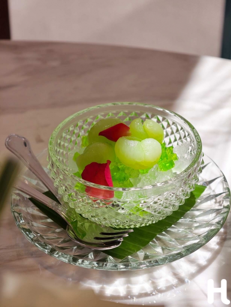 อีกวัตถุดิบมงคลจากห้องพระเครื่องต้น เม็ดบัวฉาบน้ำตาลโตนด ที่เชฟนำเม็ดบัวหลวงนึ่งมาฉาบน้ำตาลโตนดและน้ำปลาดี ได้รสหวานเค็มและกลิ่นน้ำตาลไหม้อ่อนๆ ราวกับเครื่องหวานในโหลแก้วของตำหนักเจ้านายสมัยก่อน