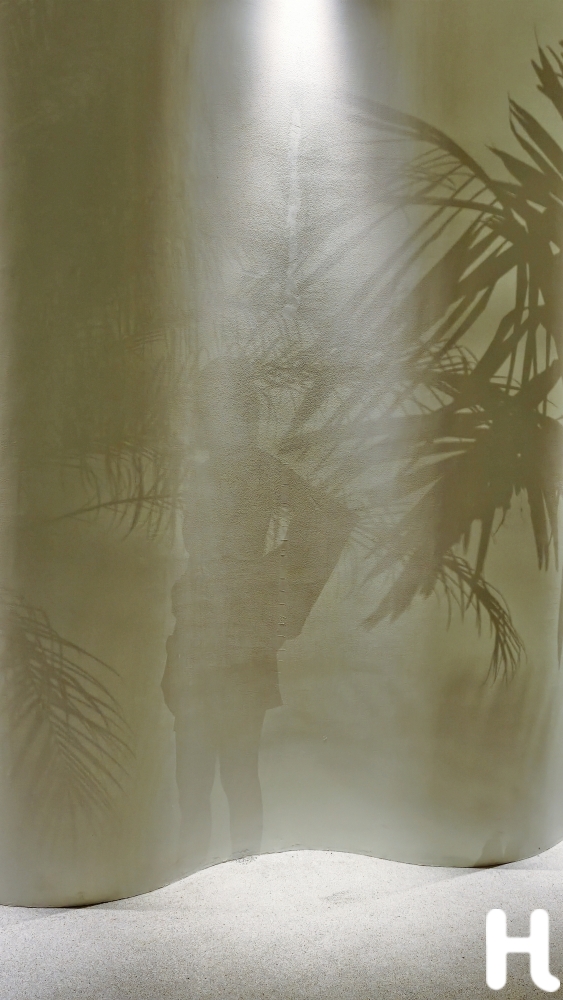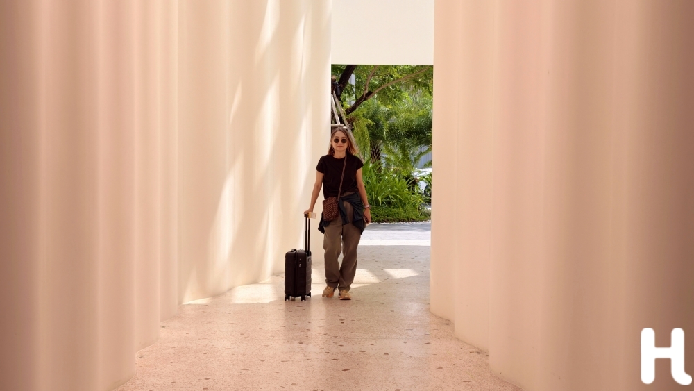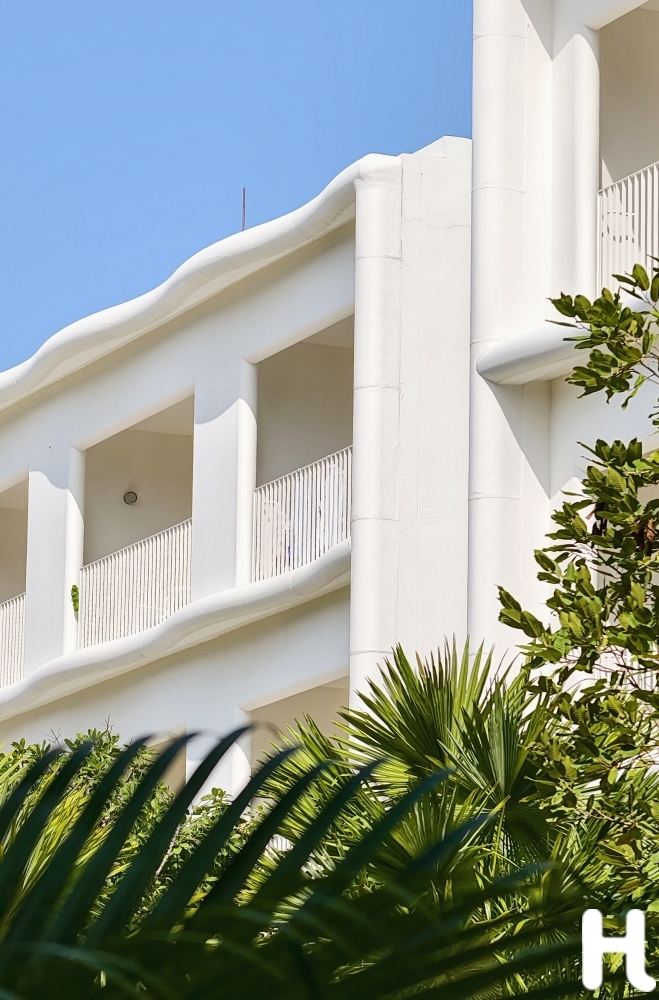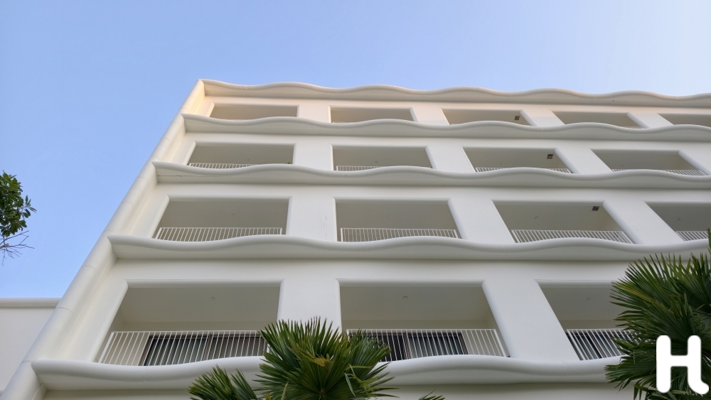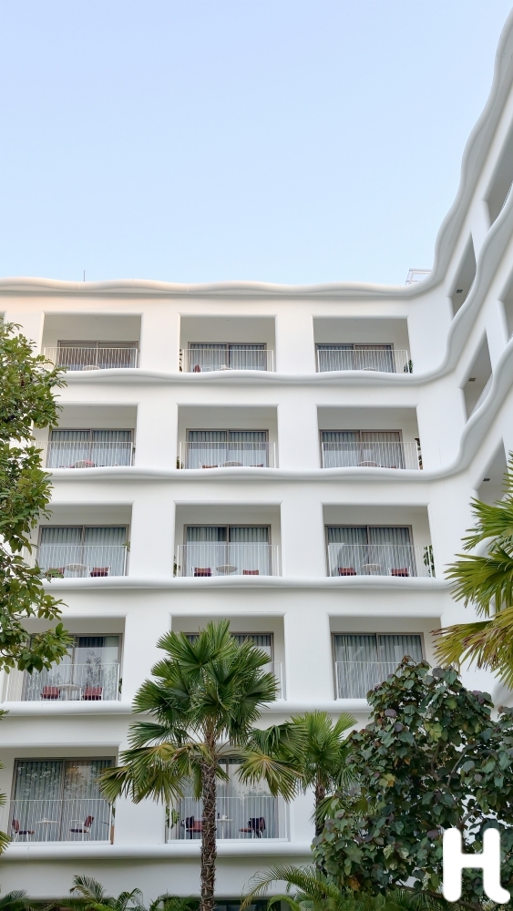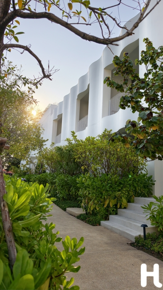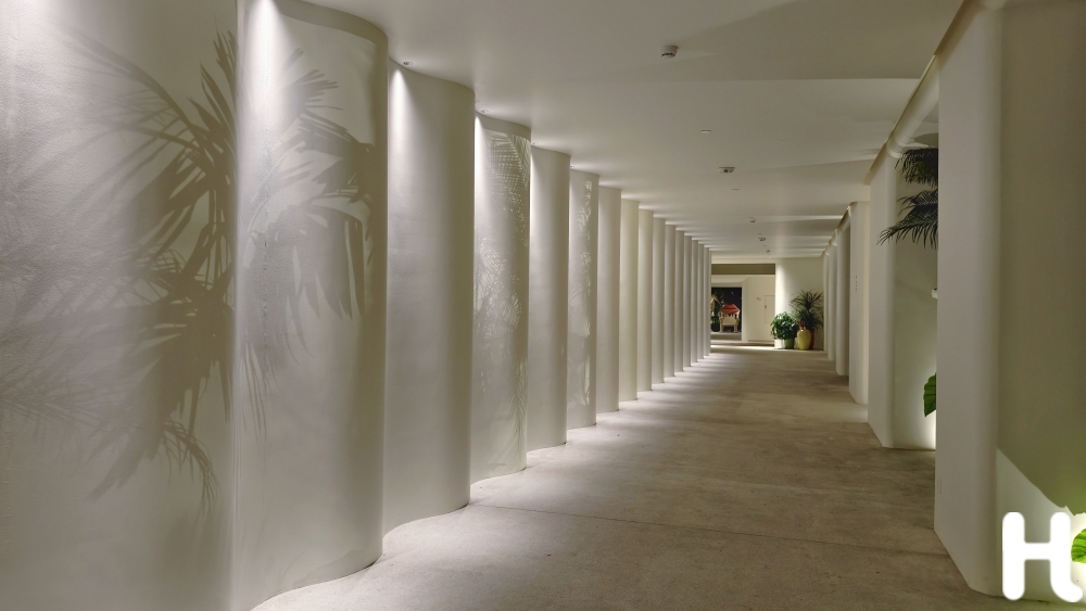 เช็กอินเรียบร้อย ทุกคนจะเดินผ่านทางเดินผนังสีขาว ตรงนี้เราเริ่มสังเกตได้ว่าที่นี่แทบไม่มีเส้นตรงแบบจริงจัง เห็นมุมที่ไม่มีคำว่าคม ทุกอย่างเหมือนถูกลดทอนความแข็งทื่อลงอย่างตั้งใจ ผ่านการเลือกใช้ “เส้นสายโค้งมน” คลื่นและวงกลม ถูกใช้ซ้ำไปซ้ำมาอย่างมีจังหวะ ผนังสีขาวนวลที่ดูเรียบในตอนแรก กลับเริ่มมีชีวิตขึ้นมาเมื่อแสงแดดเคลื่อนผ่าน เงาที่ทอดทับกันไปมาเปลี่ยนรูปทรงของพื้นที่โดยไม่ต้องขยับอะไรเลย