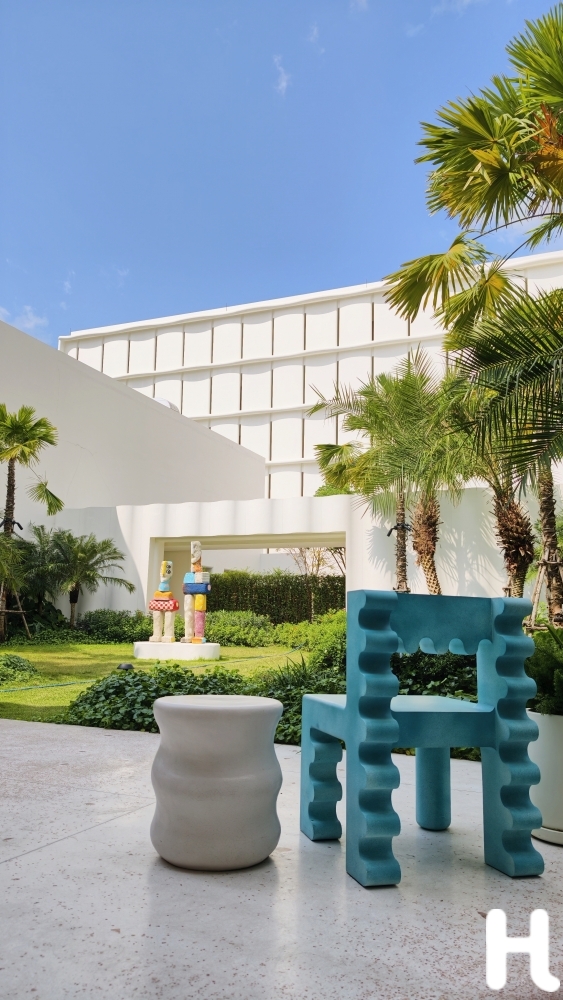 ใกล้กันมีสวนที่มองเห็นงานประติมากรรมจัดวางตรงใจกลาง ใครมาเช็กอินต้องเห็น เป็นผลงานที่มีชื่อว่า “Unity of the Double” ของ Chloé Kelly Miller และ MozART Advisory ที่สร้างขึ้นเพื่อที่นี่โดยเฉพาะ สื่อถึงธีมความเป็นสองขั้ว ครอบครัว และการกลับมารวมตัวกันที่เต็มไปด้วยความสุข
