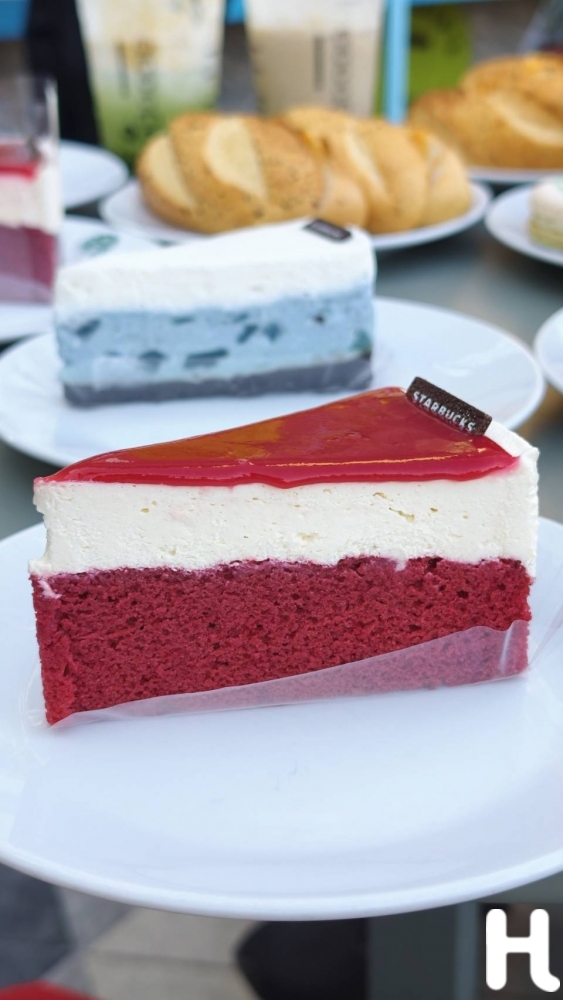 ● เค้กเรดเวลเวทเเละสตรอว์เบอร์รี (Red Velvet & Strawberry Cake) เค้กเรดเวลเวทเนื้อนุ่มสีแดงสดใส เลเยอร์ครีมชีสรสเปรี้ยวหวาน เข้มข้นเนียนละมุน ท็อปด้วยซอสสตรอว์เบอร์รีรสหวานอมเปรี้ยวที่ช่วยเพิ่มความสดชื่น