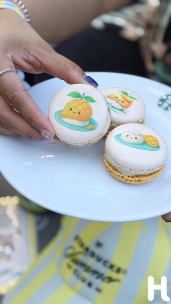 ● มาการองข้าวเหนียวมะม่วง (Mango Sticky Rice Macaron) การผสมผสานรสชาติข้าวเหนียวมะม่วงที่คุ้นเคยกับมาการองที่หวานหอมเป็นเอกลักษณ์ สัมผัสกรอบนอกนุ่มใน สอดไส้รสข้าวเหนียวมะม่วงครีมและเจลลี่ที่เข้ากันอย่างลงตัว
