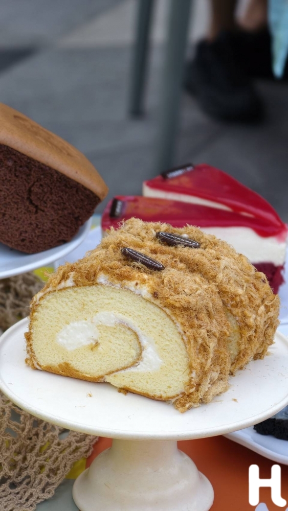 ● เค้กโรลหมูหยอง (Pork Floss Roll Cake) เค้กโรลเนื้อสปองจ์นุ่มฟูสอดไส้ครีมสดรสละมุน โรยด้วยหมูหยองคุณภาพเยี่ยมแบบจัดเต็ม ให้รสชาติเค็มหวานกลมกล่อมและหอมมันในทุกคำ