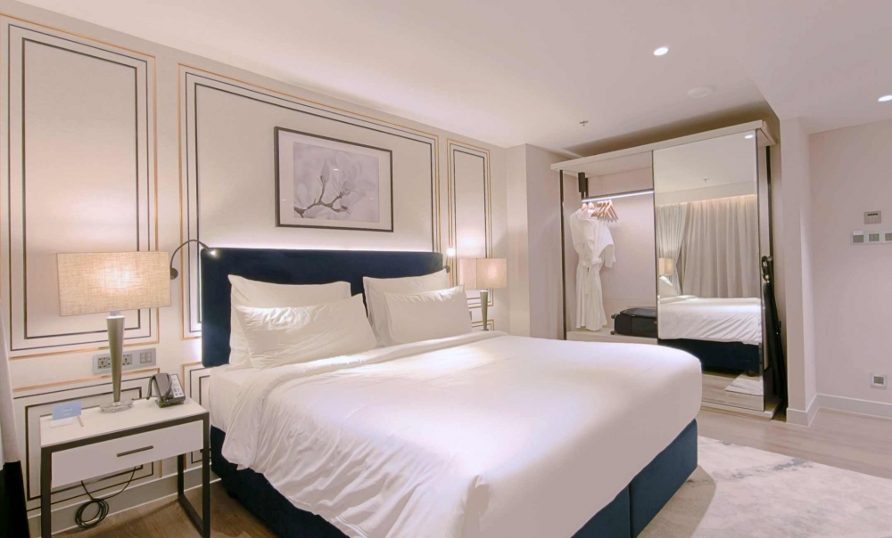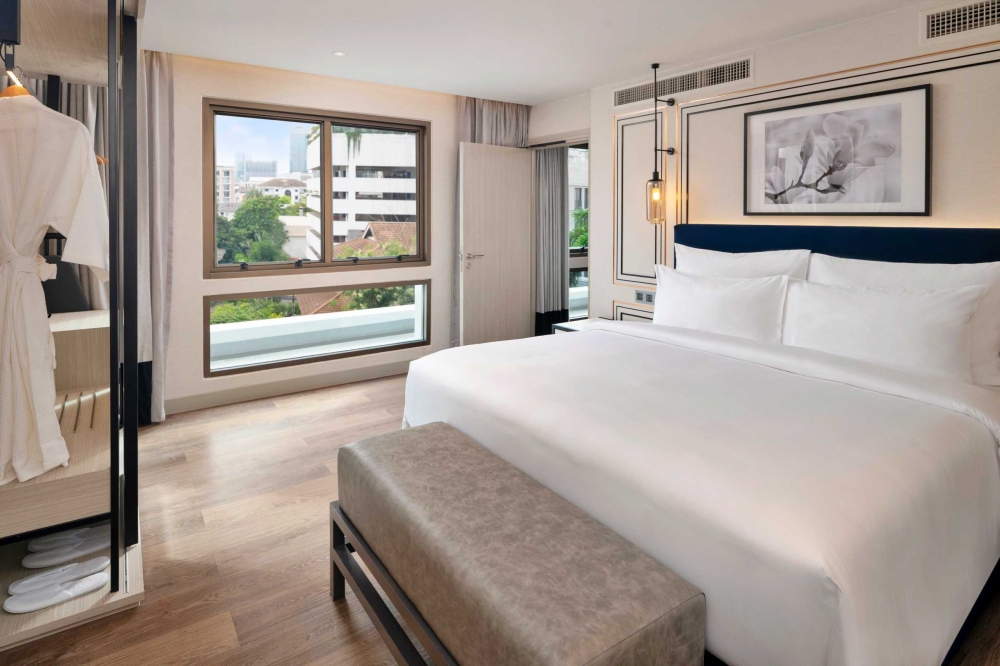 หนึ่งในจุดเด่นที่รู้สึกได้ทันทีคือ “พื้นที่” ห้องพักและสวีททั้ง 178 ห้อง ไม่ได้แค่สวย แต่ตอบโจทย์คนชอบเที่ยว ชอบนอน ชอบความอยู่สบาย เตียงที่นี่นุ่มกำลังดี มีพื้นที่ใช้สอยกว้าง และหลายห้องมาพร้อมวิว skyline ของกรุงเทพฯ แบบเต็มตา