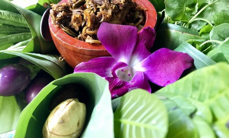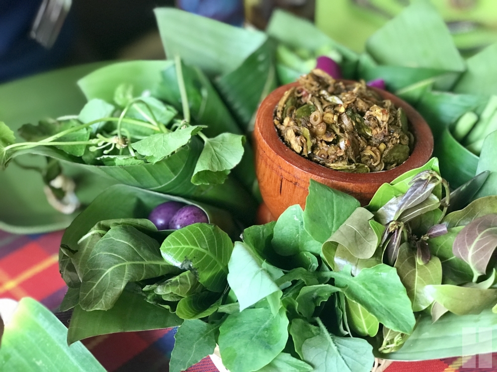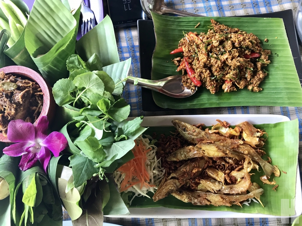 จานที่ไม่ใช่แกงอย่างของทอดหรือคั่วกลิ้งใช้ใบตองรองจาน และผักแกล้มจัดใส่กรวยใบตองสวยงามและดีต่อสิ่งแวดล้อม อันนี้ให้คะแนนเพิ่มอีก