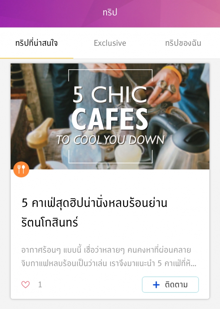 นอกจากใช้เป็นแผนที่แล้ว แอปนี้ยังใช้จัดทริปทั้งทริปที่คุณออกแบบด้วยตัวเอง หรือจะดำเนินรอยตามทริปที่แอพแนะนำไว้ก็ได้เหมือนกัน เช่น ทริป “ตะลุยย่านกรุงเก่า8 พิกัดรอบเกาะ” ที่แอพคัดสรร 8 สถานที่เด็ดที่ถ้าคุณมาถึงเกาะรัตนโกสินทร์แล้วไม่ควรพลาดมาให้คุณได้สนุกกัน หรือทริป “ตะลุย 5 คาเฟ่สุดฮิป” ที่อ่านแต่ละที่แล้วอยากไปมันทุกที่เลย เพราะร้านนั้นก็บรรยากาศดี ร้านนี้ก็กาแฟน่าอร่อย ที่สำคัญคือถ้าไม่สำรวจข้อมูลในแอปมาก่อนอาจจะไม่รู้จักหรือหาเองไม่เจอด้วยสิ