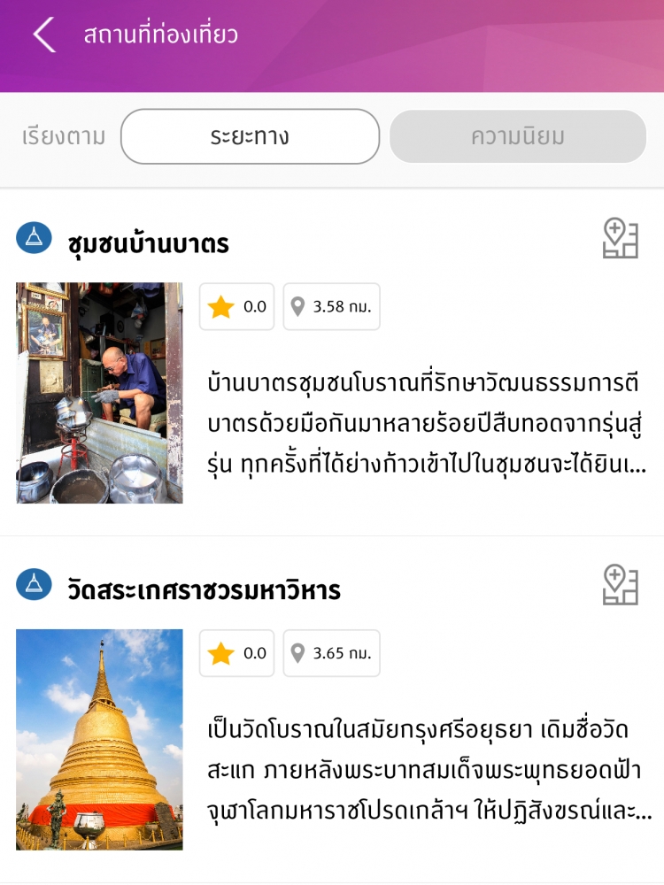 ทีนี้ลองเข้าไปดูในแอพกันบ้าง เปิดแอปขึ้นมาหน้าแรก บนสุดเราจะพบกับหมวดหมู่ที่แบ่งไว้อย่างคร่าว ๆ ว่า “กิน” “เที่ยว” “ช้อป” และ “อื่น ๆ” ซึ่งตรงนี้แล้วแต่ความสนใจของแต่ละคนเลย สมมติว่าเราเลือกหมวด “เที่ยว” เปิดเข้าไปเราก็จะพบกับข้อมูลน่าสนใจของแหล่งท่องเที่ยวน่าไปเยี่ยมเยือนที่รวบรวมเอาไว้หมดทั้งพื้นที่เกาะรัตนโกสินทร์ โดยมีทั้งวัดวาอาราม สวน พระราชวัง เรื่อยไปจนถึงหอศิลป์และพิพิธภัณฑ์ต่าง ๆ รวมถึงพื้นที่ชุมชนที่เข้าไปเดินเที่ยวก็น่าสนุก อย่างชุมชนบ้านบาตร ชุมชนโบราณที่รักษาวัฒนธรรมการตีบาตรด้วยมือมาหลายร้อยปี เป็นต้น