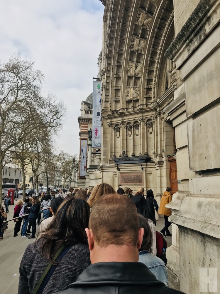 ซึ่งด้วยความที่ตั้งใจไปแบบไม่ซีเรียสมาก และไม่อยากไปยืนหนาวหน้าพิพิธภัณฑ์นานเกินไป วันแรกที่ไปต่อแถวก็เลยไปถึงราว ๆ 9.50 หรือสิบนาทีก่อนพิพิธภัณฑ์วีแอนด์เอจะเปิด ผลปรากฏว่าหลังจากอยู่ในแถว(ยาวมาก)หน้าพิพิธภัณฑ์ซักครู่ ก็ได้เดินเข้ามายืนเข้าแถวต่อข้างในแบบไม่หนาวเหน็บมากต่อ (โชคดีเท่าไหร่แล้วที่ไปลอนดอนในช่วงเวลาที่ฝนไม่ตกซักแหมะ นึกสภาพว่าถ้าไปยืนกลางความหนาวพร้อมเปียกแฉะไปด้วยคงดูไม่จืด) แต่โชคร้ายที่ไปช้าเกินไปนิด ตั๋วของวันนั้นขายหมดก่อนจะถึงคิวเราประมาณไม่ถึงสิบคน และทางพิพิธภัณฑ์ไม่มีการขายล่วงหน้าข้ามวันด้วย ตอนแรกก็ว่าจะถอดใจ แต่วันสุดท้ายที่อยู่ลอนดอน ช่วงเช้าเรายังเหลือเวลาพอตลอดเช้าจนถึงราว ๆ บ่ายสอง ก็เลยคิดว่า งั้นจะลองเสี่ยงดวงดูอีกครั้ง ตื่นให้เช้าหน่อย ออกไปให้ถึงซัก 9โมง แต่งตัวให้รัดกุมพอที่จะยืนทนหนาวได้เป็นชั่วโมง และนั่นแหละ..ที่ทำให้ในที่สุดเราก็ได้เข้าไปดูนิทรรศการนี้