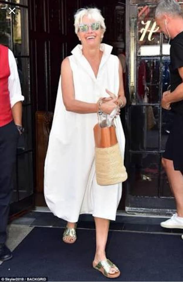 จะเห็นว่าความสง่าของเอ็มม่าอยู่ที่รูปหน้าและทรงผม พอขาวหมดทั้งหัวแล้วตัดทรงนี้สวยมาก ใส่อะไรก็ดูดี เอ็มม่าเป็นคนมีรูปร่างสมวัย คือมีเนื้อช่วงสะโพก เอวและต้นขา จึงเลือกใส่กางเกงขากว้างที่พรางต้นขา เสื้อที่คลุมเอวสะโพก เหมาะกับคนไม่มีเวลาจะผอม เชิญทัศนาสไตล์ของเอ็มมาได้จากภาพประกอบค่ะ